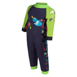 The Splashy range is constructed using an exclusive e-Flex™ material which is a combination of stretchy Nylon, soft comfy plush inner and a waterproof sandwich filling of recycled plastic. This sunsuit has stretchy and close fitting Lycra for the arm and leg hems for added comfort and fit. There's a zip, velcro and popper arrangement closing the back and the inside is a lovely soft plush for added comfort.