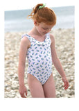 A really pretty new girl’s swimsuit from Mitty James in white with blue roses everywhere, and a frill around the neckline.