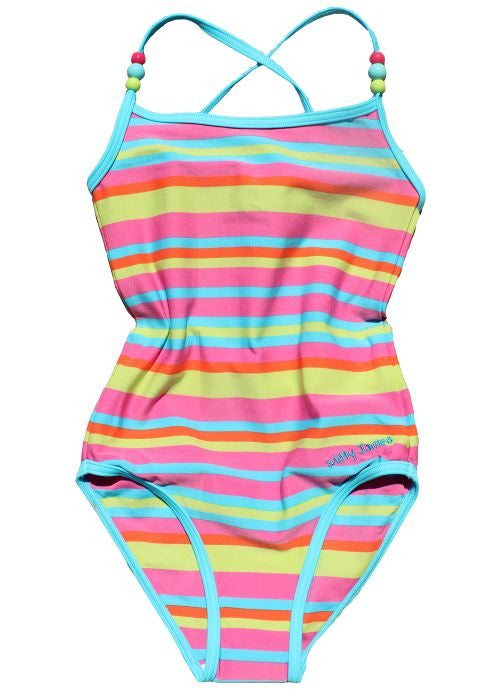 Very cool, a new premium quality Mitty James girl’s swimsuit in a cool turquoise stripe. Looks great with matching tropical hair band or turquosie beach robe!