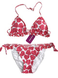 A cute new girl’s bikini from Histoire de Plage in white with red hearts everywhere. It has an adjustable neck fitting, and a clip at the back. The bikini pants have ties at the sides which are adjustable.