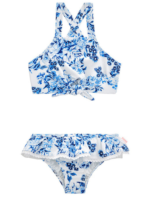 Simply gorgeous from Seafolly Little Girls Forget-me-not collection - the cutest new girl’s bikini – in a China Blue floral print. The bikini has a frilled skirt with a lace trim.