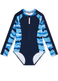 In the cool new Paradise blue print, this long sleeved sunsuit is rated at UPF 50+ sun protection.