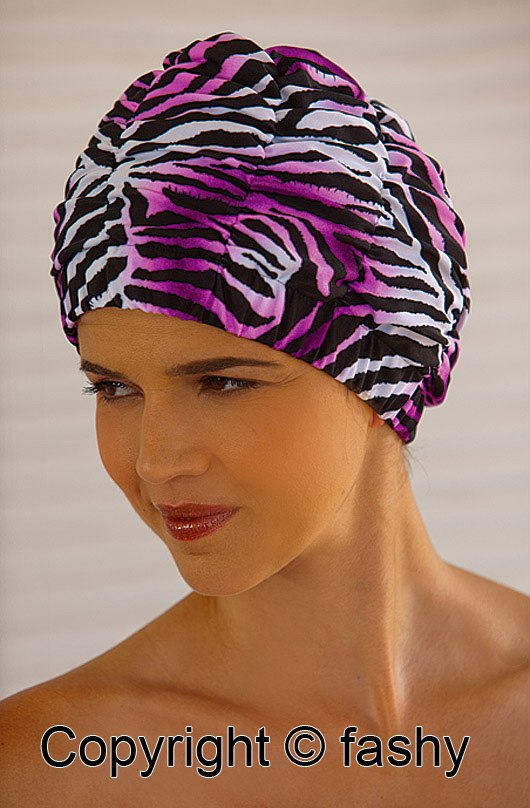 Made from polyester, this shower cap has a waterproof lining and a snug fitting headband to keep water out.