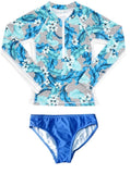 In a cool new Hawaii Jungle print, this girls rash top set is rated at UPF 50+ sun protection.