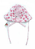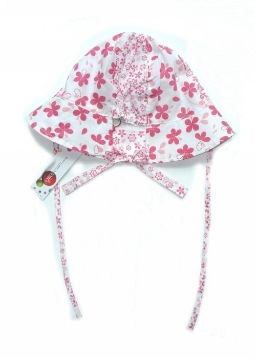 This stunning white baby sunhat has pink flowers everywhere, and matches the pink flower dress and knickers set for babies.