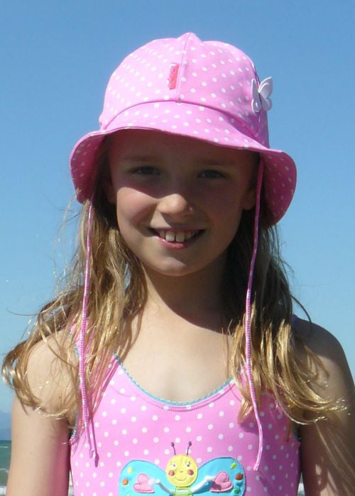 This raspberry pink sunhat with white dots, teams up with our raspberry girl’s swimsuit.
