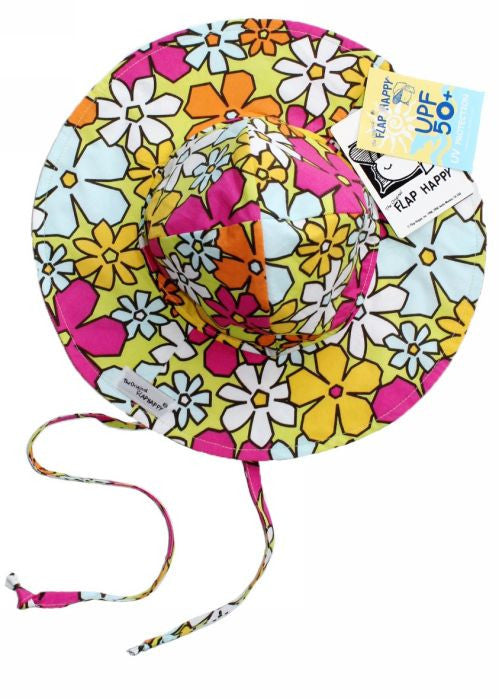 Sun protection UPF 50+ - a new very cute Hana Lei design in pink, lime, orange and blue flowers everywhere, a fabulous wide-brim sunhat, perfect to protect your baby or toddler from the sun. They also have ties to keep them on! 100% soft cotton with a soft white cotton lining.