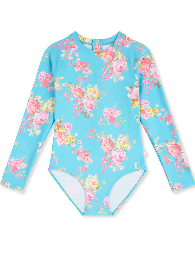 In the cool new Paradise blue print, this long sleeved sunsuit is rated at UPF 50+ sun protection.