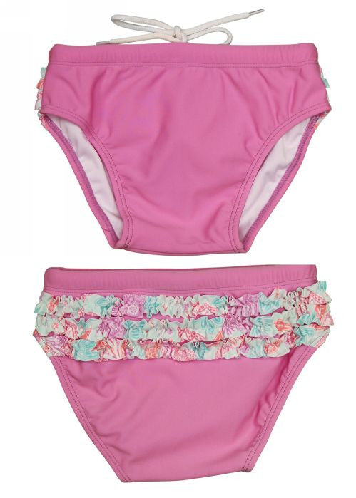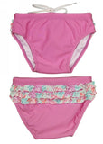 A cute baby girl’s swim nappy in pink with gorgeous pink paisley frills on the back. A practical solution for taking your baby swimming, without having to worry. These snug-fitting swim nappies have an inner liner to contain any "accidents" and are designed to be worn in pools. They can be washed and re-used and will retain the soft comfort of the fabric.