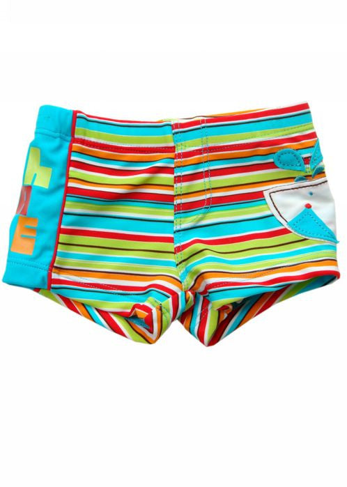 Cool boy’s swimming trunks from Bóboli in a cool multi-coloured stripe with turquoise sides, print, perfect for your holidays or swimming lessons! Elastic waist, no drawstring, Bóboli boys swimwear is comfortable and fast-drying.