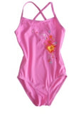 Gorgeous new girl’s swimsuit from Albetta, in pretty pale pink with appliquéd flowers everywhere. This girl’s swimsuit is lined, and has cross-over shoulder straps. 80% nylon 20% Lycra™.