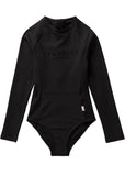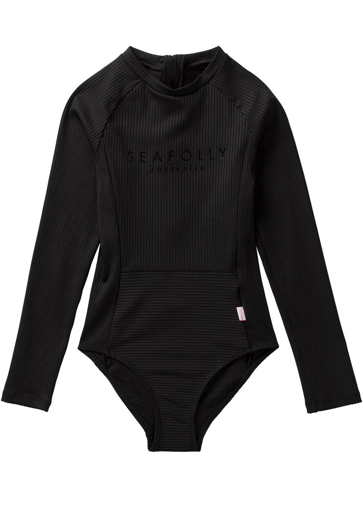 The Seafolly Summer Essentials long sleeved black panelled paddlesuit for Girls features comfortable styling, crafted from soft-stretch recycled fabric.