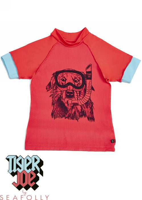From the new Tiger Joe range from Australia, this Scuba Red short sleeve UV rash T-shirt for boys, offers UPF 50+ sun protection. This cool UV rash top is perfect for wearing with boardies when swimming, sailing or under a wetsuit.