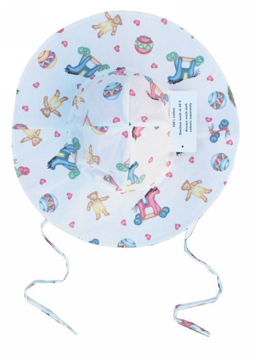 A very cute girl’s round sunhat in ivory with teddies everywhere.